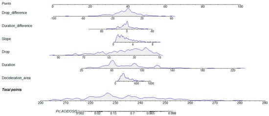 To illustrate the weight of the variables in the prediction model, we provide a nomogram in Figure 5. The nomogram shows the weight of variables in the model. For each individual, a score is assigned to each variable on the upper axis. By summing up these scores, a total score is obtained, which provides us with the probability of acidosis on the lower axis. Considering the variability of points assigned on the nomogram, the variables that show the most difference are the duration, the drop, and the drop difference. In these variables, we observe more variation among individuals, but both the drop and the drop difference do not yield very high scores compared to the drop. On the other hand, the duration difference, slope, and deceleration area exhibit reduced variability, but due to their high scores, even slight variations within their range can be highly significant in providing a high probability of acidosis.