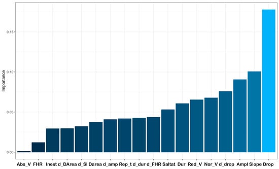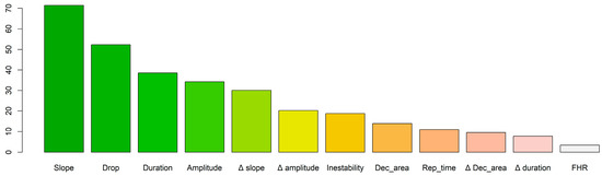 The slope is the variable that best discriminates in the first node, followed by the duration of the deceleration on the second level, and the duration for the left branch or the reperfusion time for the right branch in the third level. To assess the impact of predictor variables on acidemia prediction, we present the variable importance (VIMP) plot in Figure 7. The VIMP quantifies the difference in prediction error when a predictor is perturbed by applying a permutation that assigns the variable to a terminal node different from its original assignment. These calculations are performed for each tree in the model, resulting in the Breiman–Cutler Variable VIMP [43]. The three variables that exerted the most influence on acidemia prediction were the slope, the drop, and the duration of the last deceleration window.
