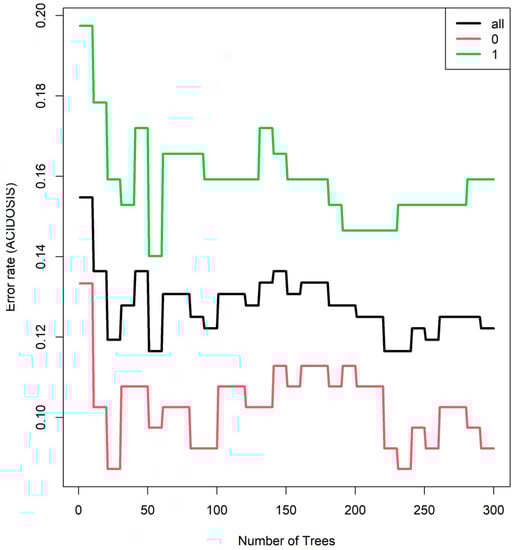 Random forests consist of an ensemble of classification trees, where each tree is trained using a unique bootstrap sample and a different combination of variables. This approach ensures diversity among the trees, resulting in a more robust model. For our analysis, we utilized a sample size of 222, which corresponds to approximately 60% of the total data, to build each tree. The splitting rule employed was Gini, and we considered 10 random split points. Furthermore, we added a total of 300 trees to the ensemble, as this number was found to be reasonable based on the reduction in prediction error depicted in Figure 8. The error rate was evaluated for the non-acidotic cases (0), acidotic cases (1), and all data, using the out-of-bag (OOB) error estimation. The data not used for building each tree were used to estimate prediction error, and an average prediction error was estimated.