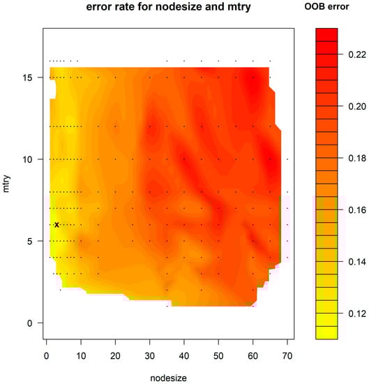 Minimization of error depending on the node size (minimum size of terminal node) and mtry (number of variables that possibly split at each node).