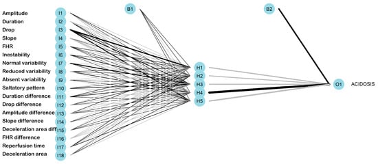 The best model was attained using an architecture of 18-5-1, indicating 18 input nodes, 5 nodes in the hidden layer, and 1 output node. A total of 101 weights were estimated, and the logistic activation function was used. The optimization function employed was cross-entropy, which measures the disparity between predictions and the actual occurrence of acidemia. The architecture of the network is visually represented in Figure 11, with positive weights depicted as black lines and negative weights shown as grey lines. The thickness of each line corresponds to the relative magnitude of the weight it represents.