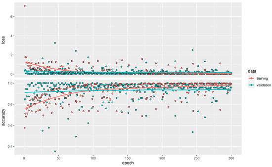 Additionally, a multilayer perceptron with two hidden layers was trained. We explored as an activation function the ReLU , linear , and sigmoid , the learning rate was fixed as 0.01, the number of epochs xplored ranged from 20 to 400, and the number of units of the hidden layer was set as 32, 64 or 128. The architecture of the best network was 16-64-32-2, with 3234 weights estimated. The activation function for the first and second hidden layers was ReLU, and softmax was used for the output layer. The loss function employed was categorical crossentropy, with the optimizer set as rmsprop, and the metric used for optimization was accuracy. The model was trained for 30 epochs, with a batch size of 128, and a validation split of 0.2 was used to estimate the convergence, as shown in Figure 13. Due to the complexity of this model, it is not graphically represented.