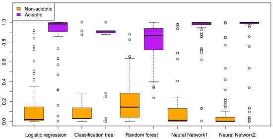Regarding the probabilities provided by the models, we presented their distribution in a comparative boxplot in Figure 14. All models exhibited a high discrimination ability. The random forest and logistic regression models provided probabilities for acidotic cases distributed across a wide range, while the neural network models produced probabilities confined to a narrower range.