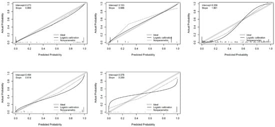For the validation, the models were evaluated through calibration, discrimination, and clinical utility. The calibration curve was used to visually assess the agreement between predicted values and actual outcomes, with a diagonal line indicating perfect calibration. Additionally, two informative parameters, ‘intercept’ (calibration-in-the-large) and ‘slope,’ were examined. The ‘intercept’ quantifies the disparity between the average predictions and average outcomes, while the ‘slope’ indicates the average influence of predictions on the outcome [40].