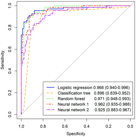 Regarding the discrimination ability, all models exhibit excellent discrimination with AUC values very close to or above 0.9. The highest AUC is achieved by the random forest model with an AUC of 0.971 (0.948, 0.993), which shows no statistically significant difference compared to the logistic regression model (0.968 (0.940, 0.996), p = 0.846), the neural network with one hidden layer (0.962 (0.35, 0.988), p = 0.352), or the neural network with two hidden layers (0.925 (0.883, 0.967), p = 0.063). However, the random forest model demonstrates superiority over the classification tree model (0.896 (0.839, 0.952), p = 0.004). The ROC curves are displayed in Figure 16.