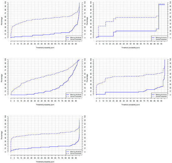 Additionally, we assessed the practical applicability of the developed machine learning models by evaluating their clinical usefulness. This evaluation involved treating the prediction models as dichotomous classification models, using a specific cutoff point to distinguish between positive (1) and negative (0) individuals above or below the threshold. To evaluate the clinical utility, we employed the clinical utility curve [42]. This curve utilizes the threshold probability on the x-axis to identify neonates as acidotic, while the y-axis represents the percentage of two distinct measures. The first measure indicates the percentage of acidotic infants that were incorrectly classified below the chosen cutoff point, and the second measure represents the number of infants falling below the cutoff point. By examining this curve for different cutoff points, we can determine the percentage of misclassified acidotic fetuses and the fetuses with a very low risk of acidemia who can be spared unnecessary cesarean sections due to fetal well-being concerns. These parameters are crucial in clinical practice.