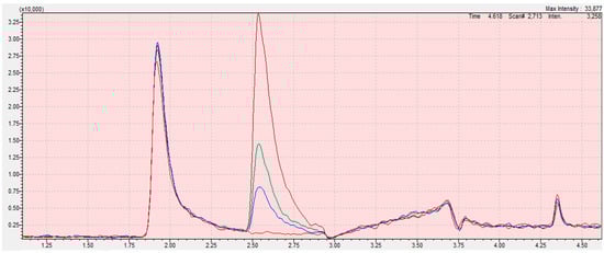 Chromatograms from the program LabSolution Insight for ethylene oxide calibration curve samples (blank (red); 0.05 mg/kg (blue); 0.1 mg/kg (green); 0.3 mg/kg (claret)) in sesame seed matrix. The scope of the integration is contained in the interval from 2.45 to 2.95 for all samples. Retention time of ethylene oxide is 2.646 min. The X-axis is the total ion current (TIC), the Y-axis is the retention time of the compound.