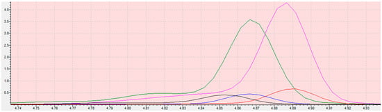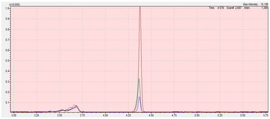 Chromatograms from the program LabSolution Insight of calibration curve samples (blank (red); 0.05 (blue); 0.1 (green); 0.3 mg/kg (claret)) of 2-chloroethanol in sesame seed matrix. The scope of the integration is contained in the interval 4.28 to 4.45 for all samples. Retention time of ethylene oxide is 4.862 min. The X-axis is the total ion current (TIC), the Y-axis is the retention time of the compound.