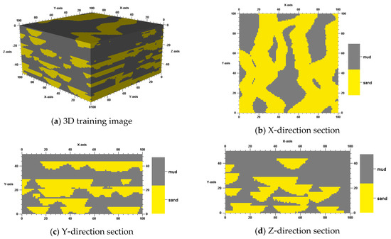 Multipoint geostatistics is the application of training images instead of variational functions to characterize the spatial relationships and distribution patterns between multiple points. After years of refinement and development, it has formed two types of multipoint geostatistics methods based on iterative and non-iterative algorithms. An important core of multipoint statistical 3D simulation lies in how to obtain training images. In order to obtain reasonable training images, scholars have proposed different methods, such as target-based simulation, 3D seismic information extraction or transformation, prototype-based model, depositional process-based method, and 2D images. Objective-based river simulation is temporarily inadequate in dealing with conditional simulation, mainly for the constraint of unconditional simulation without conditional data. It can produce well-formed river channels and natural levees, but the broken fan cannot be well characterized. For three-dimensional seismic information extraction or transformation, prototype model-based and depositional process-based methods are deterministic models. When the existing data are not perfect, there are always some uncertain factors in people’s understanding of it. It is difficult to grasp the real characteristics or properties of reservoirs at any scale, so if the reservoir has randomness, then these deterministic modeling methods will not be applicable. The biggest advantage of the two-dimensional image method is that it does not need three-dimensional training images and only needs a certain number of two-dimensional maps to realize multipoint geostatistical modeling. However, this method is difficult to quantitatively show the three-dimensional geometric characteristics and phase transition law of the reservoir, and its practicability is poor. The training image can be two-dimensional or three-dimensional, and the three-dimensional training image can be constructed by several methods. The first method is to build 3D training images directly using target-based or process-based algorithms; another method is to estimate the spatial distribution of the entire 3D model using statistical information obtained from multiple 2D training images [1,2,3,4,5,6]. However, in practical 3D applications, it is difficult to obtain 3D training images of some complex geological objects, such as the fallen silt layer inside the bar.