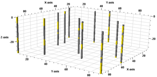 Using the target-based algorithm, parameters such as model mesh size, phase type, channel wavelength amplitude, and width were set, and a fluvial facies model with a mesh size of 100 × 100 × 50 was generated as a 3D training image (Figure 3a). Slices along x, y, and z in three different directions are obtained from the 3D model of the work area as 2D training images, as shown in Figure 3. The slice mesh sizes in the x-, y-, and z-directions were 100 × 100, 100 × 50, and 100 × 50, respectively (Figure 3b–d). The gray value is 0, indicating the background mud; a yellow value of 1 indicates channel sand. The well data distribution is shown in Figure 4.