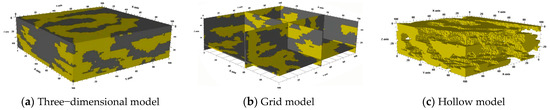 Using 2D channel training images in three directions in Figure 3b–d and the conditional data obtained in Figure 4, the maximum scanning score was set at 0.3, and the grid size of the output model was 100 × 100 × 30 to generate three-dimensional models, grid models, and hollowed-out models, as shown in Figure 5. As can be seen from the grid diagram and hollow diagram of the model, the geometric morphology and spatial structure of the reconstructed model are better, and the visual results show that the three-dimensional model can be generated in accordance with the geological understanding by using two-dimensional slices.