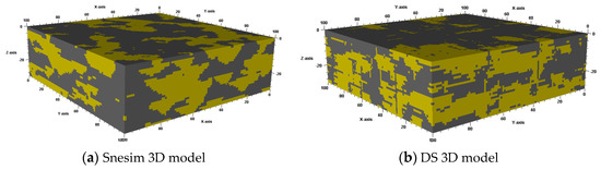 The Snesim method uses a 3D training image in Figure 3a to generate a 3D geological model, and the DS method uses b-d three 2D training images in Figure 3 to simulate a 3D geological model. See Figure 6 for the 3D model generated by conditional simulation. The size of all models is set to 100 × 100 × 30. The geometric form of the 3D model reconstructed by the Snesim method is consistent with the geological cognition, while the 3D model reconstructed by the DS method has more noise and poor morphological performance.