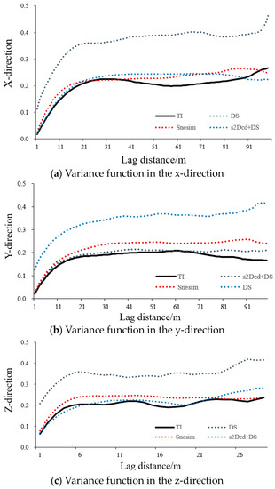 In order to evaluate the spatial variation characteristics of the algorithms in this paper, the 3D models generated by the above three algorithms were first evaluated in terms of the variance function with the original training images in the x-, y-, and z-directions. The variance functions are shown in Figure 7.