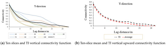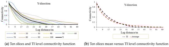 (1) The algorithm in this paper is used to generate the y-direction connectivity of the 3D model as an example (Figure 8). Ten slices with positions of y = 10, 20, 30, 40, 50, 60, 70, 80, 90, and 100 are selected in the y-direction of the 3D model, and the horizontal and vertical connectivity of each slice is found with equal spacing, as shown in Figure 8 and Figure 9. The connectivity curves of the 10 slices in the y-direction basically match with the training image, confirming that the 3D model generated from the 2D slices can obtain higher-order statistics while obtaining spatial correlation and location distribution features similar to those deposited in the training images.