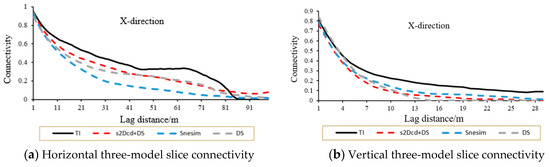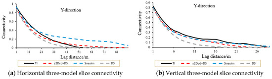 Figure 11 shows the comparison of the connectivity of sandstone in the y-direction. Figure 11a shows the connectivity curves of different lag point pairs in the horizontal direction and the best agreement between the method and TI in this paper; Figure 11b shows that the comparison of vertical connectivity and the connectivity curves of the method, TI, and Snesim in this paper are similar, and the deviation of DS and TI is relatively large.