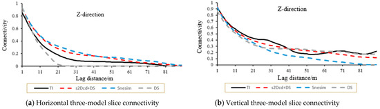 Figure 12 shows the comparison of the connectivity of sandstone in the z-direction, and Figure 12a shows the connectivity curves of different pairs of lag point pairs in the horizontal direction, from which it can be seen that the connectivity curves of this paper and the Snesim method are similar, and the overall trend is similar to that of TI, and the s2Dcd+DS method is closer to the horizontal connectivity of the training image in the z-direction. The s2Dcd+DS method no longer has connectivity at the lag distance of 23, and the overall trend differs significantly from the training image. Figure 12b shows the comparison of vertical connectivity. The connectivity curves of the method, DS, and Snesim in this paper are similar to the training images and converge approximately.