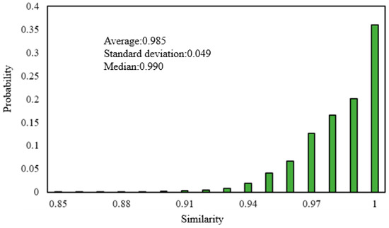 The histogram of the probability distribution of the similarity calculation of the fluvial facies implemented by the s2Dcd+DS method is shown in Figure 14. From the mean, standard deviation, and median of the histograms, it can be seen that the model reproduction rate deviation of the simulation implementation results of the method in this paper is small, indicating that the conditional simulation implementation of the two fluvial facies types can reproduce the training image a priori geological model better.