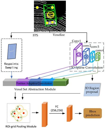 PV-RCNN [], which is a two-stage 3D point cloud object detection method, mainly adopts a two-step strategy of point–voxel feature aggregation for accurate 3D object detection. This combines the advantages of both point-based and voxel-based methods to obtain multi-scale feature information, including multi-scale voxel semantic information and the location information of points. The voxel set abstraction module in PV-RCNN draws upon the concept in PointNet++, which is theoretically successful, but in practice has also traded off its design flexibility for effectiveness [], resulting in poor object detection accuracy [].