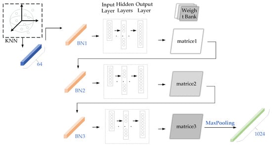 Therefore, we redesigned the convolutional kernel function to enable it to learn point features dynamically. As shown in Figure 3, we first defined a weight library consisting of several weight matrices. Next, we designed a vector of LearnNet learning coefficients to combine the weight matrices based on the location of the points. Finally, we generated dynamic kernels by combining the weight matrices and their associated positional adaptation coefficients. In this way, the kernel is constructed in a data-driven manner, giving our approach greater flexibility than 2D convolution to better handle irregular and disordered point cloud data. In addition, we make the learning process less complex by combining weight matrices rather than forcing the kernels to be predicted from the location of the points.