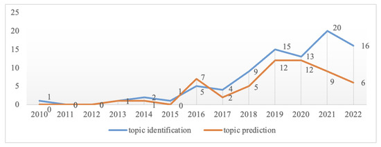 This study counted the number of topic identification and prediction documents per year to obtain an overview of their overall development. This is shown in Figure 2. It can be seen that since 2010, the research on topic identification and its trend prediction has been on the rise, which rise can be divided into two stages. The first stage is the beginning stage, from 2010 to 2015, with zero to one article published per year. The second stage is a steady rise from 2016, with 5 to 15 identification articles and 7 to 12 prediction articles published per year, which indicates the attention has gradually increased. After 2019, the number of identification articles per year has increased from 15 to 20, reflecting that the research on topic identification and prediction has become an important topic in the academic research.