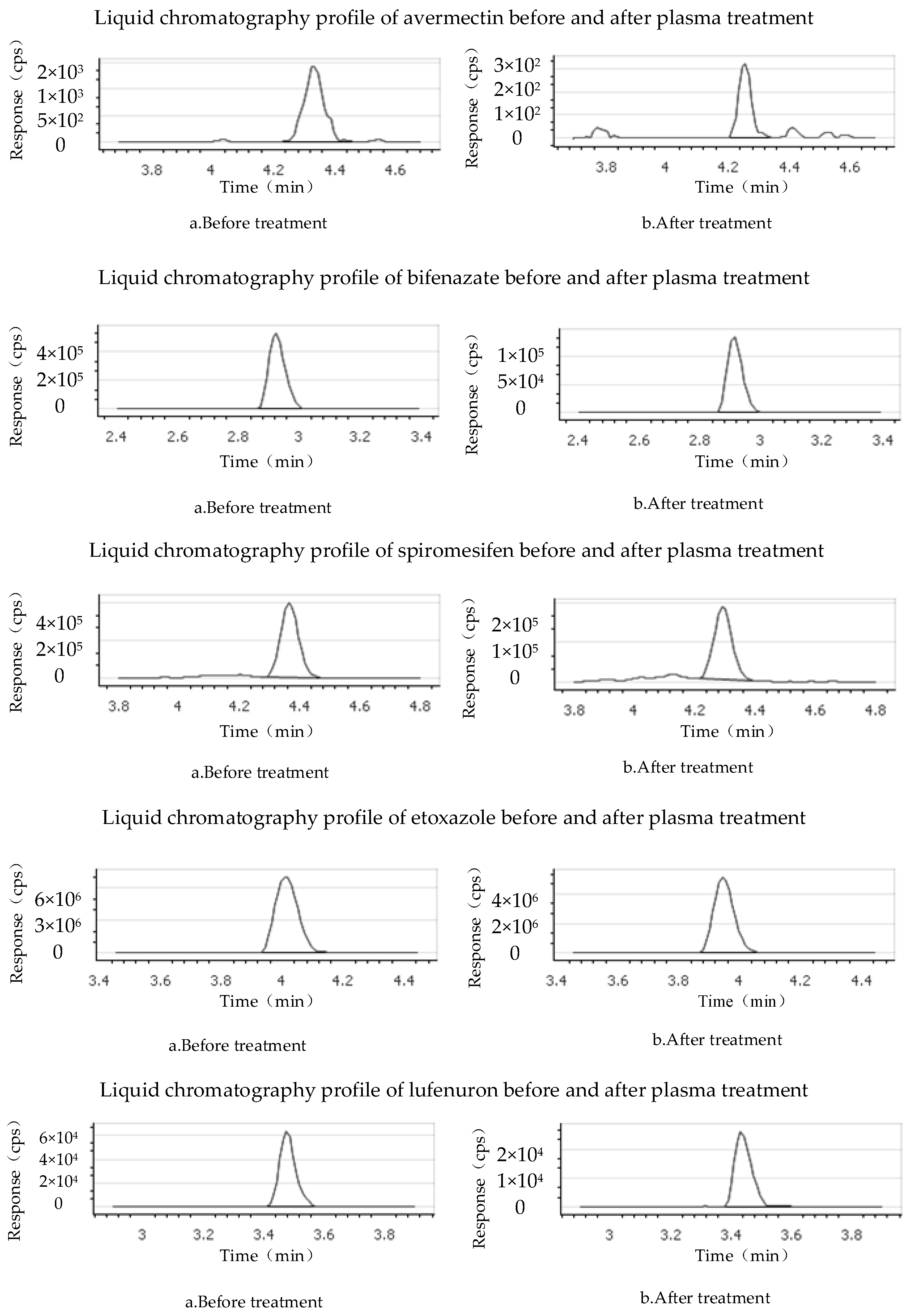 3.2. Plasma Degradation Effect of Five Acaricides on the Surface of Kumquats