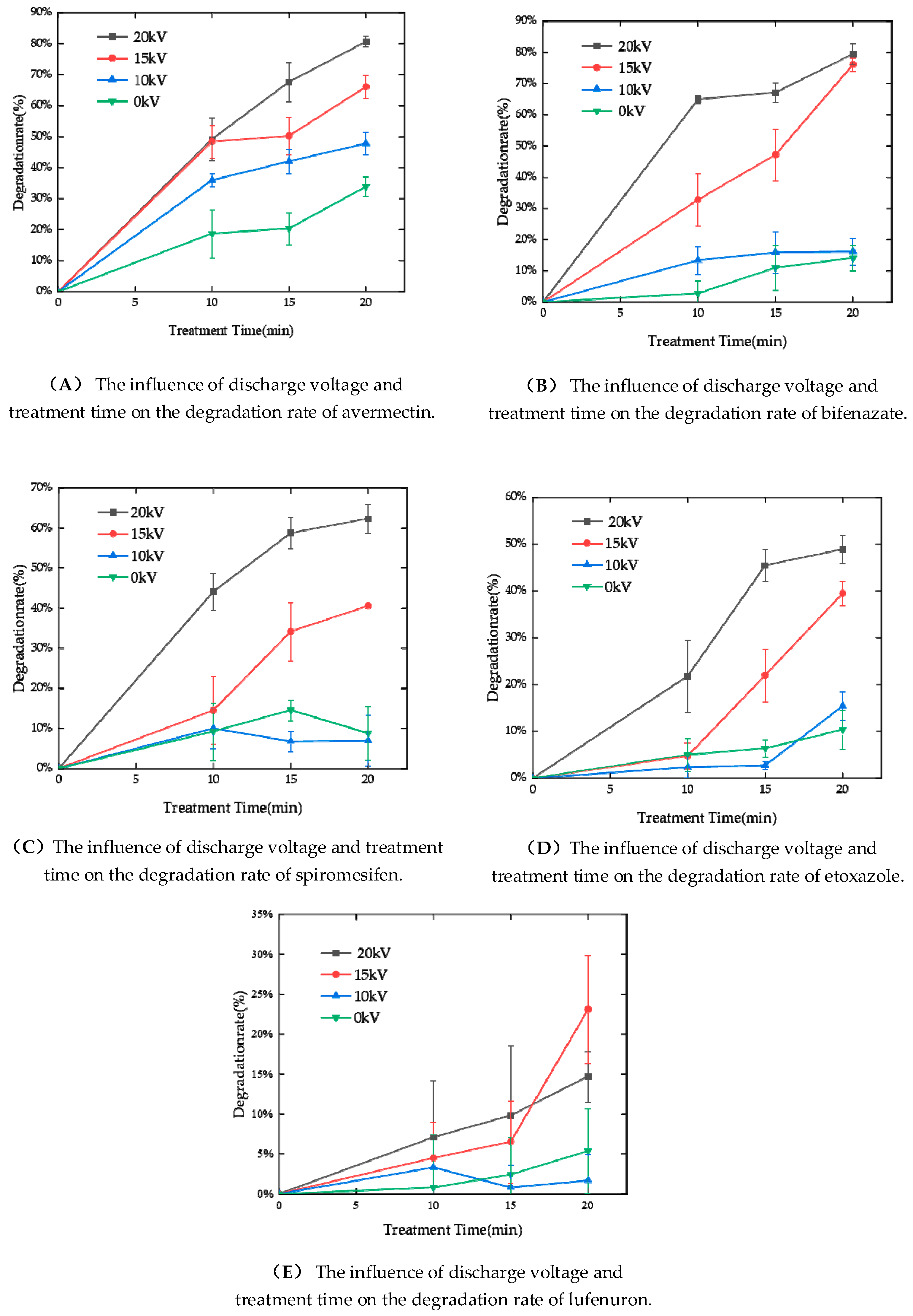- Lv, Y.; Zou, L.; Li, H.; Chen, Z.; Wang, X.; Sun, Y.; Fang, L.; Zhao, T.; Zhang, Y. Investigation of non-thermal atmospheric plasma for the degradation of avermectin solution. Plasma Sci. Technol. 2021, 23, 5. [Google Scholar] [CrossRef]