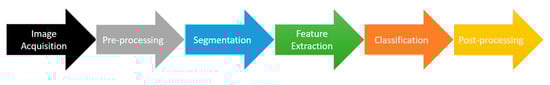 Predominantly, the performance of OCR by an OCR system or engine involves the following steps: (1) image acquisition, in which the image is collected; (2) pre-processing, which involves steps to preprocess the previously acquired image, such as binarization and thinning; (3) segmentation, which can be performed either line-wise, word-wise, or character-wise; (4) feature extraction, in which the important visual features are extracted, which can help in the subsequent step; (5) classification, in which the recognition is performed by devising models that utilize the features extracted previously; and (6) post-processing techniques, which deal with the produced text to correct it further [22,23].