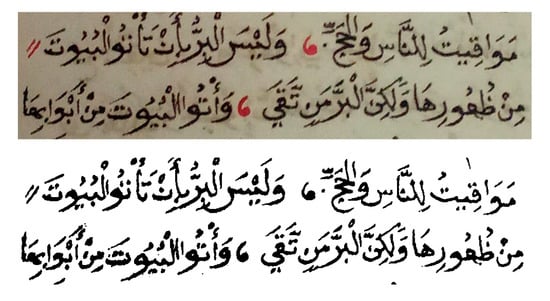 - Mohd, M.; Qamar, F.; Al-Sheikh, I.; Salah, R. Quranic Optical Text Recognition Using Deep Learning Models. IEEE Access 2021, 9, 38318–38330. [Google Scholar] [CrossRef]