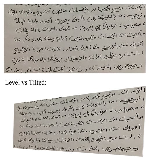 - Tilting (perspective distortion): The page itself may not appear in a correct, parallel perspective. The taking of photographs of texts by non-experts without the use of a scanner can account for such non-parallelism, making the task difficult. A simple solution is to use scanners or to try to take photographs for each page while perceiving the perspectives. An example is shown in Figure 4;