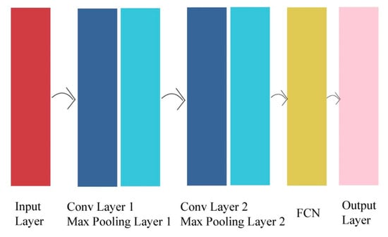 The CNN solves the problem of the requirement of an excessive number of parameters, as in fully connected networks. Moreover, it preserves the spatial context, so the output of the convolutional layer takes the shape of a picture. Most importantly, it possesses translation equivariance; that is, the passage of an image through the convolutional layer is almost the same as the translation of the output of convolution; therefore, class prediction across the different layers is almost the same. It consists of four types of stacked layer, followed by an FCN to perform the classification; these layers are the convolutional layer, padding, stride, and pooling. The convolutional layer is the core of the CNN, as it reduces model capacity compared to the FCN. In addition, it is efficient at detecting spatial patterns. It mainly applies the cross-correlation with a kernel that has learnable parameters. Padding adds zeros around rows and/or columns to inflate the size of the output. The stride jumps rows and/or columns to reduce dimensionality and computation. The pooling works as a voting or averaging mechanism to make the representation manageable and smaller. It is important to note that padding, stride, and multiple channels are non-learnable parameters. An example of a CNN is shown in Figure 7.