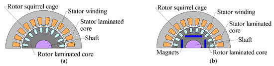 Line-start permanent magnet synchronous motors (LSPMSMs) do not have noticeable rotor winding losses at steady state, which increases their energy efficiency class in comparison to induction motors. LSPMSMs are available on the market and mostly are employed in pump and fan units [5,6,7]. Figure 1 shows a comparison of IM and LSPMSM designs.