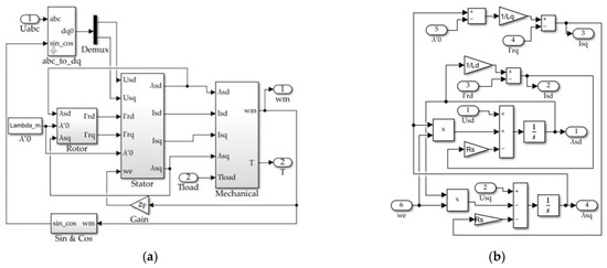 where Usd and Usq are the stator voltages along the d and q axes; Isd, Isq, I′rd, and I′rq are the stator and rotor currents; Lsd, Lsq, Lrd, and Lrq are the stator and rotor total inductances; Lσd and Lσq are the rotor leakage inductances; λsd, λsq, λ′rd, and λ′rq are the stator and rotor flux linkages; λ′0 is the permanent magnet flux linkage; Rs is the stator resistance; Zp is the number of motor pole pairs; r′rd and r′rq are the rotor resistances; φ is the mechanical rotational angle equal to the integral of the motor speed ω; T is the motor torque; Tload is the loading torque; J is the total moment of inertia. All initial conditions are equal to zero, except for the stator flux along the q-axis λsq 0 = λ′0.