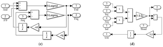 Simulink model of the LSPMSM motor in the d-q axes. (a) General view of the model; (b) calculation of stator currents; (c) calculation of rotor currents; (d) torque calculation.