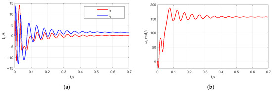 LSPMSM starting simulation results: (a) d and q-axis stator currents; (b) motor speed ω.