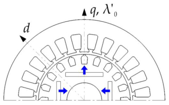 Axes d and q of the rotor relative to the permanent magnet magnetization direction (indicated by blue arrows).