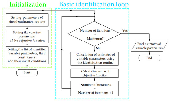 In the basic identification loop, using the identification algorithm (DE or NM), the next estimate of the identified parameters was calculated, which was the input of the objective function. In the objective function, the simulation of the Simulink model was called using the function “sim” [42], whose inputs were the name of the model, its initial state, etc., and the output was the vector of simulation results of the Simulink model.