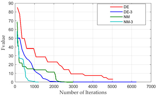 As was stated earlier, the implementation results of the two algorithms (DE and NM) were compared for the LSPMSM parameter identification problem. DE is a multidimensional optimization algorithm which belongs to the stochastic optimization algorithms group. DE is the result of further development of the genetic algorithm [38]. According to the original definition, DE can be described as follows. Initially, a set of vectors called generation is created. N-dimensional points where a minimized objective function f(x) is determined are considered as vectors. The algorithm creates a new generation of randomly combined vectors from the previous generation. The number of vectors is the same for each generation, and this is one of the algorithm parameters.