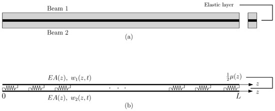 In this paper, we consider a class of composite beams formed by two identical straight elastic beams connected together and subjected to longitudinal vibration. Practical examples of this system are steel beams connected by an adhesive layer on the contact surface and wood beams connected by means of wood studs that hinder sliding at the common interface. A schematic view can be seen in Figure 1. In mathematical terms, the small free undamped longitudinal vibration of such a composite beam of length L is governed by the differential system in [2]