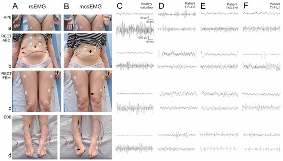 The principles of sEMG methodology with pairs of bilateral electrodes placed bilaterally during recordings from a—abductor pollicis brevis (APB), b—rectus abdominis (RECT ABD), c—rectus femoris (RECT FEM), d—extensor digitorum brevis (EDB); (A)—sEMG performed at rest (rsEMG), (B)—sEMG performed during the attempt of maximal contraction (mcsEMG) in a healthy volunteer (C) and in patients with iSCI at different spinal levels (D–F). Each upper recording in (C–F) was recorded at rest, while the lower was during the attempt of the maximal contraction. Arrows in (B) indicate the signs of the 5-s attempt of maximal contraction. Calibration bars for the amplification and the time base presented in (C) are the same for all the recordings.