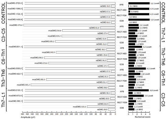 Analysing the results recorded in certain groups of patients with injuries at different levels of the spinal cord in comparison to the healthy subjects, the highest MAS and rsEMG values, as well as the lowest Lovett Scale and mcsEMG scores, were found in C3–C5 iSCI patients in most of the key muscles. Patients with Th7–L1 injuries represented moderate MAS and rsEMG results, while the muscle strength and motor units’ activity appeared to be the worst in the extensor digitorum brevis muscle (see Figure 1F). Patients with Th3–Th6 incomplete injuries generally presented a moderate level of muscle pathology compared to the above groups (Table 4; see an example in Figure 1E). The graphical presentation of the measured parameters’ variability is shown in the charts in Figure 2. In general, the results of all parameters from clinical and neurophysiological studies are statistically different from the normative recorded in the control groups, but the least in recordings from APB muscles in patients from the Th3–Th6 and Th7–L1 groups.