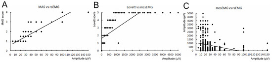 Graphical presentation of relationships presented in Table 5; spasticity scores (MAS) vs. resting sEMG amplitude recordings (A), muscle strength scores (Lovett) vs. maximal contraction sEMG amplitude recordings (B), rsEMG amplitude recordings vs. maximal contraction sEMG amplitude recordings (C). Most points on charts are overlapped multiple times with their Y–X locations.