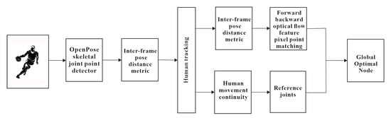 Secondly, a video-based human pose estimation algorithm is proposed. This algorithm consists of several steps. Firstly, the human pose is estimated using the OpenPose algorithm for still images. Then, a human tracking model is established based on inter-frame pose distance metric, and UltraPixel segmentation is performed on the images to locate the UltraPixel where skeletal joints are located. The UltraPixel is connected with the box centered on the joint point, and the intersection between the UltraPixel and the box is considered as the minimum candidate joint point set. Forward and backward searching for better joint points is conducted based on optical flow and human motion continuity to establish the candidate joint point set and the reference joint point [41]. Finally, the optimal global human pose is generated for each frame by reorganizing these body parts, and the key points with lower confidence are generated in each frame to generate a better candidate joint point set [42].