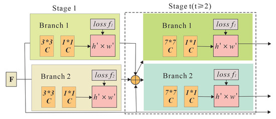 To facilitate iterative network structure and outcome prediction for each branch, a loss value is assigned at the end of each stage. The upper and lower branch networks incorporate distinct loss functions, which quantify the dissimilarity between the predicted and ground truth values.