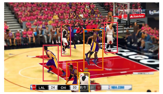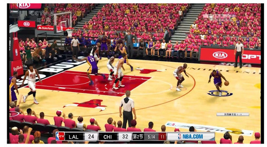 In addition, a number of images of standard basketball games were collected for calibration tests for stance identification and movement analysis of players in standard basketball games, as shown in Figure 5. The footage of a regular NBA game, with the following footage of the real part of the game, had 10 players on the court and each player in the frame was of medium size. This paper focused only on the stance of the players, so when marking the test set joints and bounding boxes, only the players were marked, not the spectators and referees, while masking marks were added to the spectators and referees in the training set, and no losses were counted in the masking range. The images currently available for calibration are around 2000, of which the test data is 400, and the image below shows an intercepted video of an NBA game.
