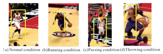Figure 7 illustrates the impact of bounding box size on pose-based motion recognition. Specifically, in the normal situation shown in Figure 7a, all movement joints were included in the bounding box. However, during running, passing, and throwing, as shown in Figure 7b–d, the tracker might fail to include all joints, thereby compromising the accuracy of pose-based motion recognition. To address this issue, this paper proposes a fixed bounding box size of 256 * 192 centered on TrackPoint, which reduces image size variation relative to network input size, enhances model input efficiency, and speeds up pose estimation. When there are multiple people, a multiple person approach is used, which avoids the significant impact of using a single person estimation method. However, this approach raises the problem of multiple people wrapping up, which requires identifying the target being tracked. To address this issue, the target is identified as the person in the centre of the box with the fullest number of joints and the largest relative response size, and the response values are accumulated for the heatmap position corresponding to each person’s joints in the box. This approach enhances the accuracy and reliability of pose-based motion recognition.