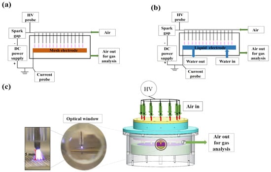 Schemes of the used experimental setups are depicted in Figure 1. Figure 1a,b represent the schematics of two different electrode configurations under investigation, namely, metal–metal (Me–Me) and metal–liquid (Me–L), respectively. At the same time, Figure 1c illustrates a 3D representation of the setup design along with a photograph of the plasma observed from the optical window. The DC voltage output of the main power supply (Technix 30 kV, 40 mA) was transferred into a pulsed voltage and distributed along 14 pins using the so-called chopping gap method, as described elsewhere [30,31]. The details about the electrical circuit used in this work are presented in the Supplementary Information (SI). The reactors studied in this work can be easily scaled up by increasing the number of pins and the applied power to any desirable value.