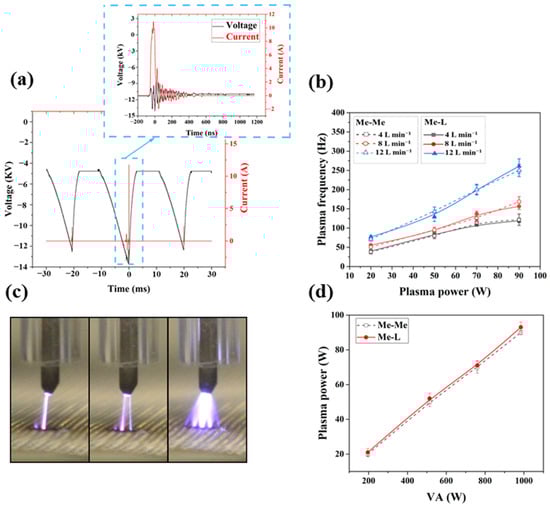 Electrical characterization of the plasmas was performed to ensure that both Me–Me and Me–L reactors could operate within the same power range. For this, the plasma voltage and current waveforms were recorded via an oscilloscope (LeCroy WaveRunner 64Xi, 600 MHz bandwidth, LeCroy, Chestnut Ridge, NY, USA), employing a high-voltage probe (P6105A, 75 MHz bandwidth, Tektronix, Beaverton, OR, USA) and current transformer (Pearson Current Monitor: model 2877, Pearson Electronics Inc., Palo Alto, CA, USA). Afterwards, the plasma power was calculated as follows: