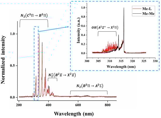 OES was employed to determine the difference in the gas phase compositions as well as the gas temperatures in the Me–Me and Me–L setup configurations. First, the emission spectra in a wide wavelength range from 200 to 900 nm were recorded, and an example of the observed spectra is shown in Figure 3. The spectra for the Me–Me and Me–L electrode arrangements repeat each other well and illustrate emissions from the first positive system of N2 (), the second positive system of N2 (, and the first negative system of () [40]. However, a clear difference between the two plasma systems is observed in the wavelength range from 300 to 315 nm, indicating the presence of the rotational band in the case of the liquid electrode, which can be more clearly seen from the high-resolution spectrum in the inset of Figure 3. These OH radicals originate from the dissociation of water available in the Me–L system. The presence of water in the gas phase is a result of plasma/liquid interactions, leading to water evaporation and decomposition into OH and H, which contributes to the OH radical emission [43,44]. It is noteworthy to mention that the OES spectra obtained at different plasma powers and different gas flow rates are very similar in terms of observed emission lines, indicating that similar radiative excited plasma species are present under all investigated conditions.