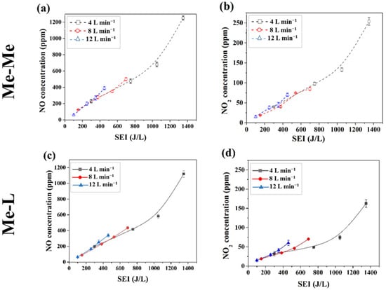 (a,c) NO and (b,d) NO2 concentrations as a function of SEI for different gas flow rates for both the Me–Me and Me–L systems.