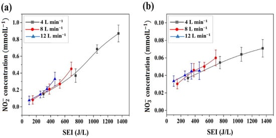 Evolution of (a) nitrite and (b) nitrate concentrations generated in the liquid phase as a function of SEI at different gas flow rates in the Me–L system.